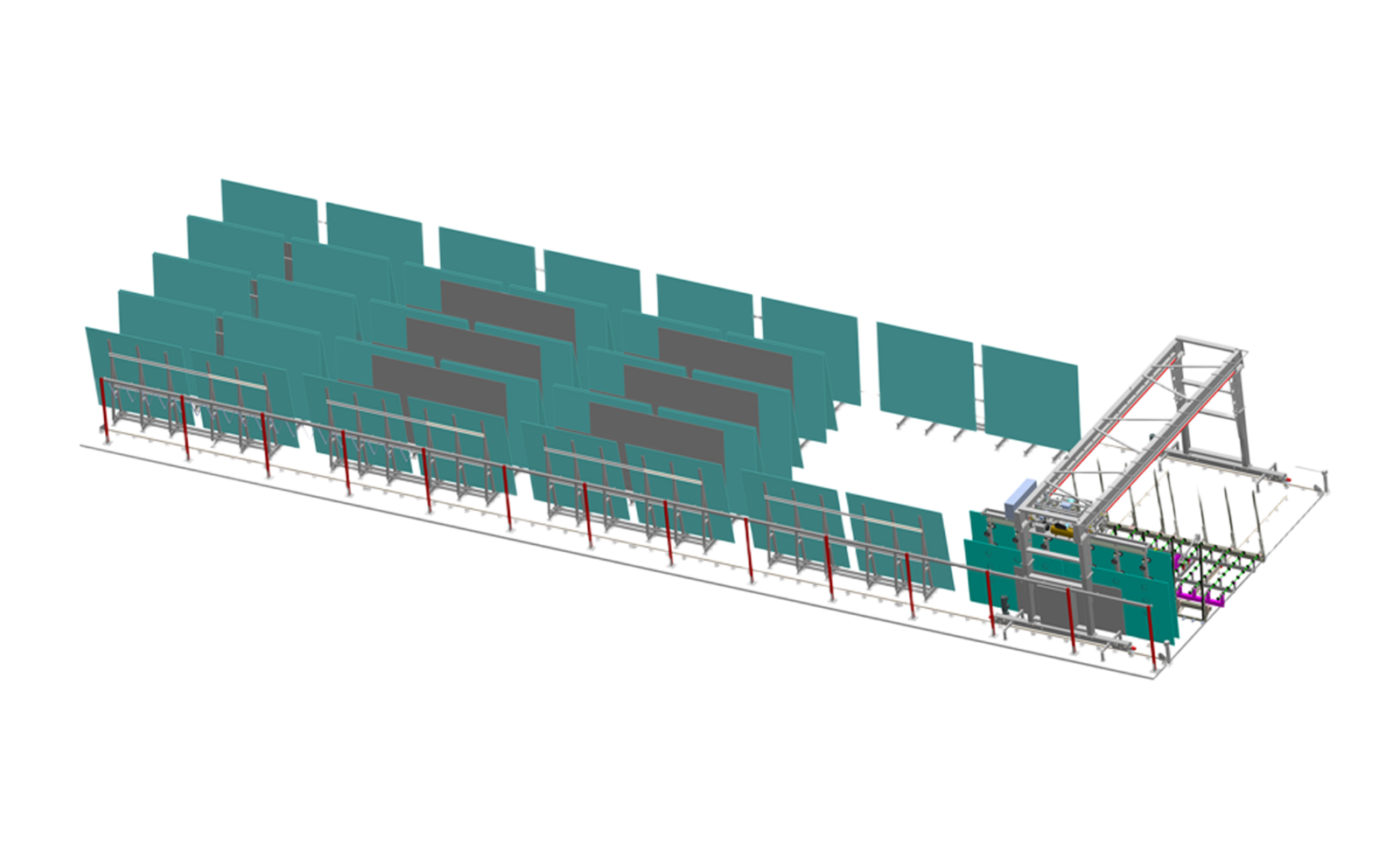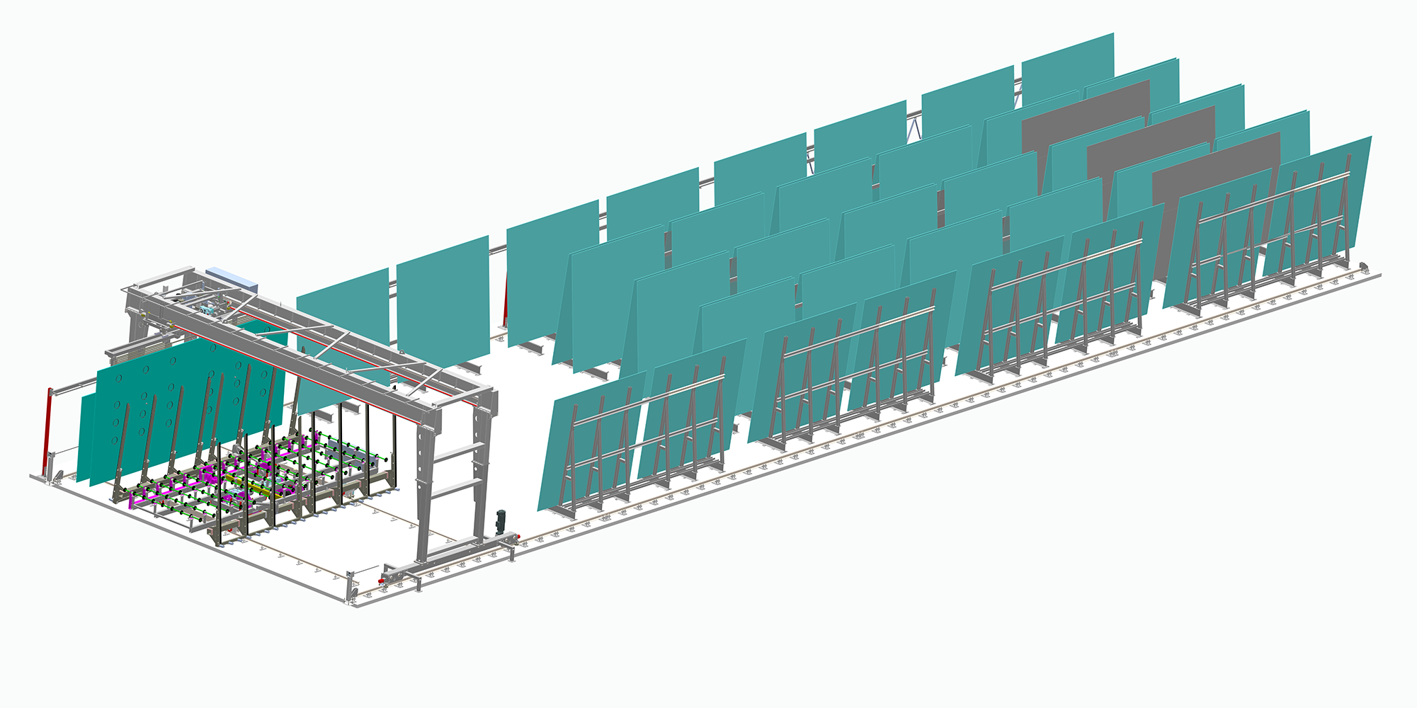 龙门式玻璃储存系统专为高容量、节省空间的玻璃储存而设计。利用高架起重机或机械臂,它能够精确地水平和垂直搬运玻璃,优化仓库空间并最大限度地减少人工干预。该系统非常适合玻璃制造商、加工商和玻璃设施,可确保安全、有序、快速地检索/放置玻璃,同时将损坏风险降至最低。
